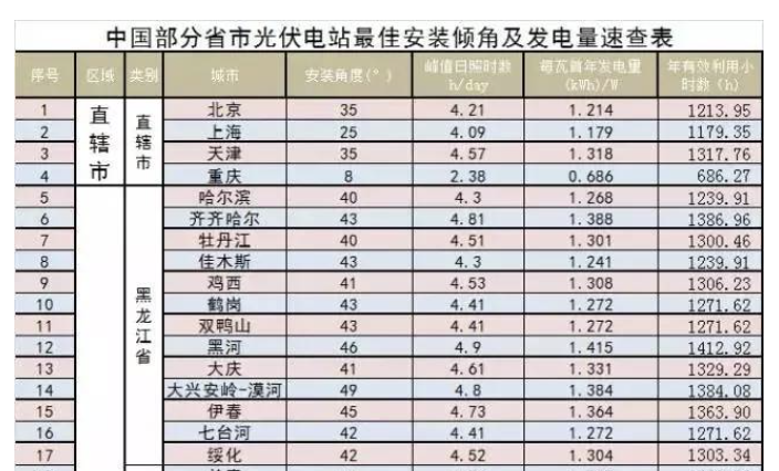 大家可以根據(jù)這個表格,查看各地合適的傾角。